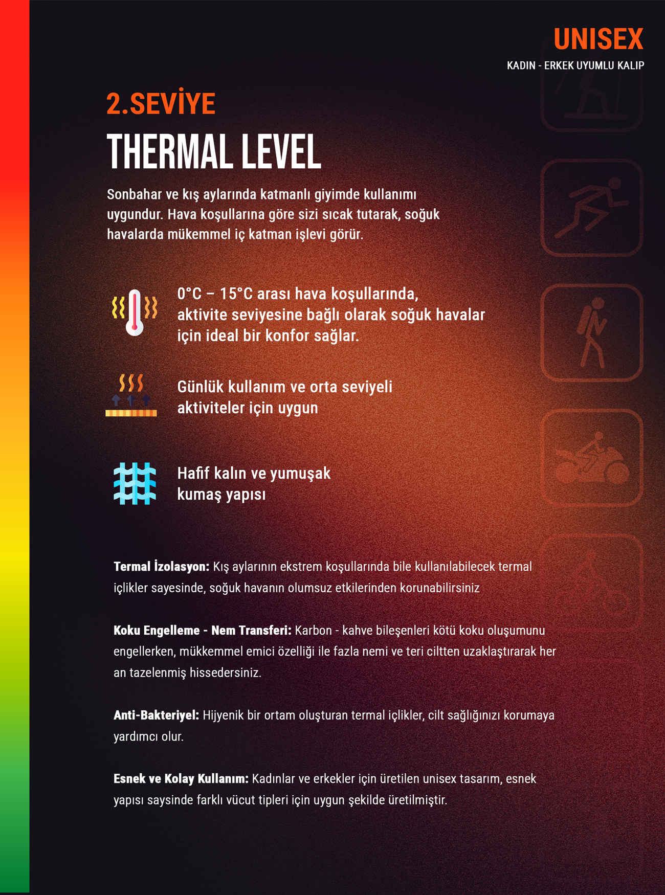 - Blackspade 2. Seviye Thermal ürünler (Active-Sports-Pro), orta kalınlıkta, vücudu saran ve esnek bir kumaşa sahiptir. Kış mevsiminde, serin ve soğuk ortamlarda iç ve dış mekan kullanımı için uygundur. Günlük kullanım veya çeşitli dış mekan aktiviteleri için tercih edebilirsiniz.